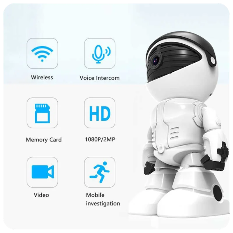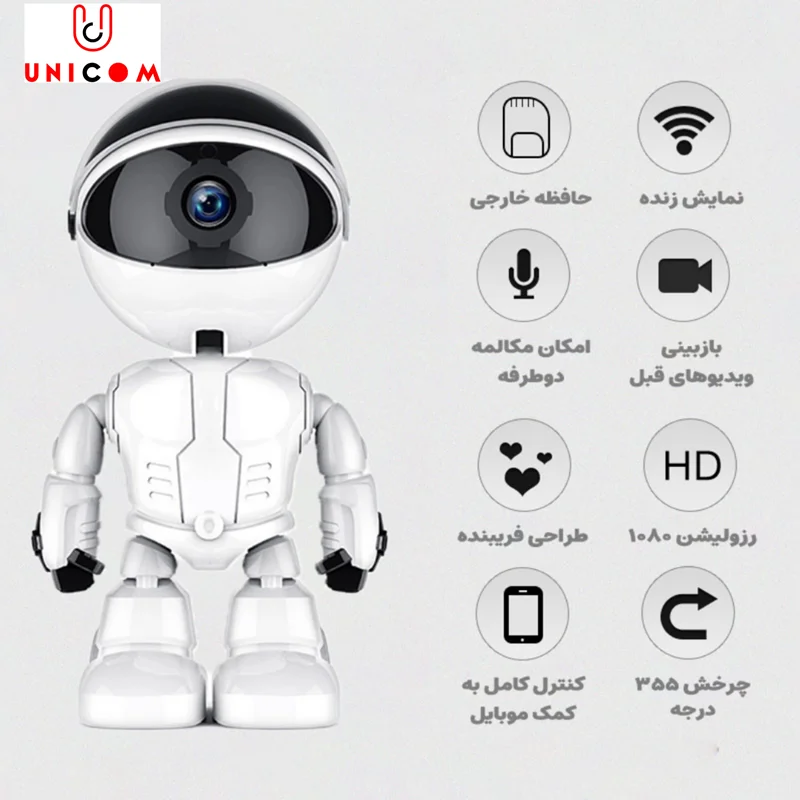 ربات هوشمند نگهبان محصولی که در آن یک دوربین با کیفیت نهفته شده است برای تأمین امنیت خانه و جلوگیری از دزدی احتمالی و مراقبت از کودکان که با طراحی جذابی که داره میتونه گزینه خرید مناسبی باشه. این دوربین با اپلیکیشن به موبایل متصل میشه. در قسمت سری این ربات دوربینی طراحی شده که در محور افقی تا ۳۵۵ درجه و عمودی تا ۴۵ درجه امکان چرخش دارد و به راحتی میتونید اطراف رو با کیفیت hd تحت نظر داشته باشید. این ربات فانتزی جذاب دارای قابلیت دید در شب هستش و فیلم هایی با کیفیت ۱۰۸۰p میتونید باهاش بگیرید و ضبط کنید. ردیابی خودکار سوژه های متحرک: این دوربین هوشمند دارای فناوری خاصی است که افراد و سوژه هایی که متحرک باشند رو شناسایی و دنبال میکند و در صورتی که رفتار مشکوکی جلوی دوربین اتفاق بیفته به شما از طریق اپلیکیشن موبایل هشدار میدهد. دارای اسپیکر و میکروفن: قطعا یکی از جذابترین ویژگی های این ربات امکان پخش صدا از راه دور است و به راحتی میتونید با کسانی که آن طرف دوربین هستند صحبت کنید. ذخیره فیلم و تصاویر: ربات هوشمند نگهبان، میتواند از کارت حافظه تا حجم ۱۲۸ گیگابایت پشتیبانی کند و فیلم و تصاویر رو براحتی ذخیره کند.