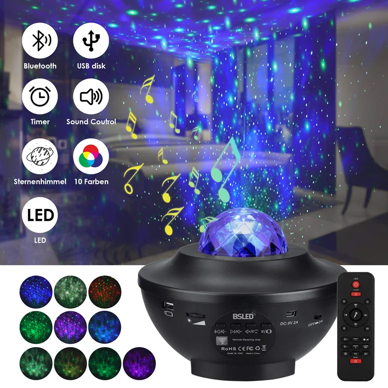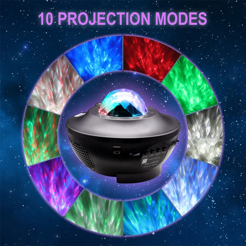 این پروژکتور لایت هوشمند ۴ رنگ اصلی داره که میتونه تا ۱۰ مدل مختلف نورافشانی کنه و تجربه ای رویایی و لذت بخش رو برای شما به ارمغان بیاره. این محصول دارای یک تم کهکشانی هستش که بین اونها ستاره های لیزری شکل میدرخشن. دارای ریموت کنترل برای تنظیم رنگ و شدت روشنایی و همچنین قابلیت تنظیم تایمر ۱ یا ۲ ساعتی. همراه با اسپیکر بلوتوثی و پخش آهنگ از طریق موبایل و همچنین فلش USB. مناسب برای اتاق خواب،هدیه،مراسم و جشن های مختلف و...