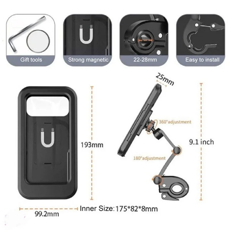 وسیله ای بسیار کاربردی ، دارای یک مگنت قوی که گوشی را محکم سر جای خودش فیکس میکند و مانع از افتادن گوشی میشود. پایه ها با پیچ های آلن روی فرمان بسته میشوند وقسمت نگه دارنده ی گوشی با بست ضامن دار به فرمان دوچرخه وصل میشود و به راحتی هم جدا میشود جنس این هولدر ازپلاستیک است و درقسمت هایی طلق به کار رفته است که زمانی گوشی درون قاب هست امکان استفاده از تاچ و صفحه آن فراهم باشد. 100% ضد آب هست و شما در آب و هوای بارانی هم میتوانید از آن استفاده کنید این هولدر قابلیت این را دارد که به صورت 360 درجه روی فرمان وسیله ی شما بچرخد به عبارتی گوشی هم بصورت افقی و هم عمودی قابل استفاده است که میتوان از آن برای فیلمبرداری حین راندن دوچرخه یا موتور نیز استفاده کرد. ضمن اینکه دسته بازویی آن قابلیت تنظیم ارتفاع روی فرمان دوچرخه و موتور را دارد.مناسب: دوچرخه سواران و موتورسواران مخصوصا شغل پیک موتوری همچنین مناسب برای تمامی برندهای تلفن همراه با سایز های مختلف ابعاد: 25*99.2*193 mmهمراه:یک عدد اچار آلن