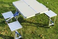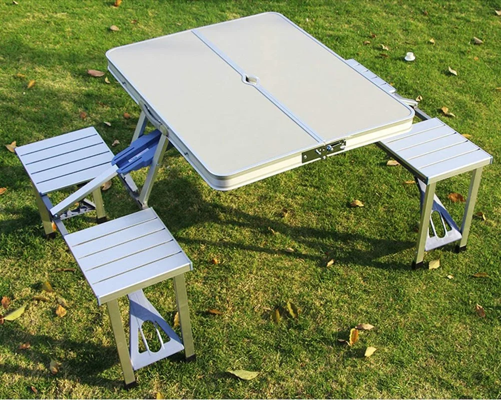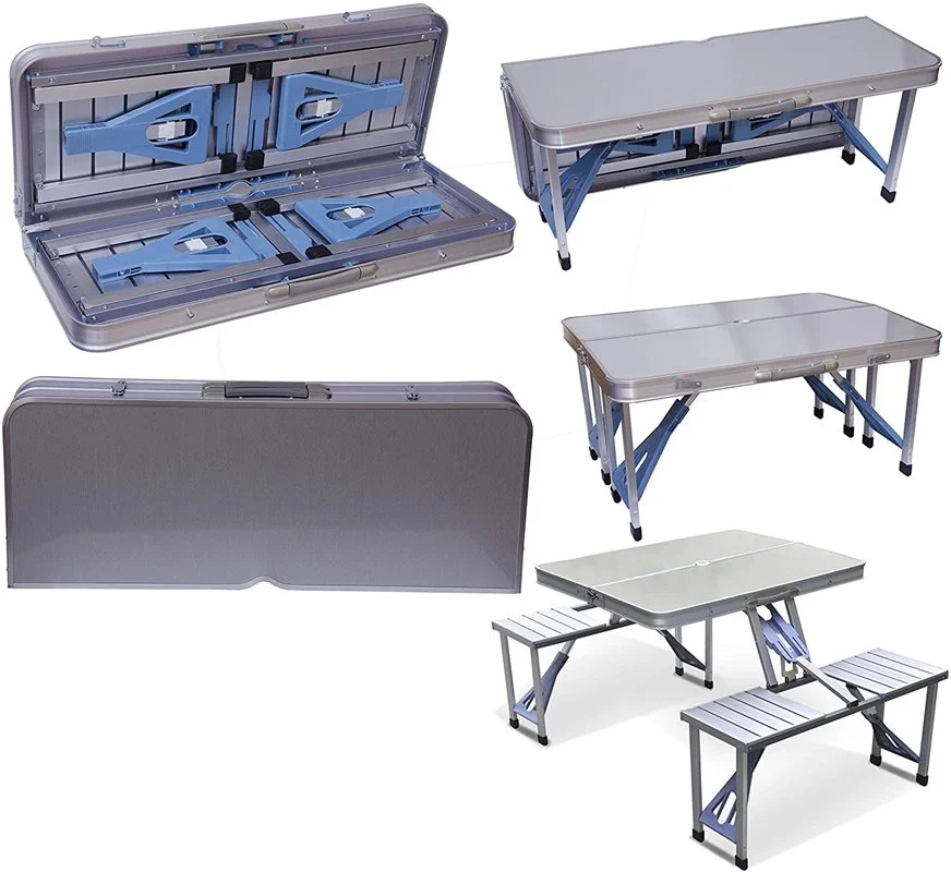 میز صندلی آلومینیومی تاشو مسافرتی یکی از محصولات کاربردی در زمینه های استراحت،غذا خوری، گردش، مسافرت و... به شمار میرود که با طراحی و ساختار بدنه ی خاصی که دارد به صورت یک کیف سامسونتی قابل حمل است و سبب راحتی کار با محصول میشود. این میز و صندلی تاشو مسافرتی دارای چهار عدد نیمکت متصل به هم هستند که راه اندازی آن بسیار ساده و آسان می باشد. جنس بدنه این محصول از آلومینیوم ضد زنگ ساخته شده است که کیفیت ساخت بسیار بالایی دارد و همچنین هر نیمکت آن دارای تحمل وزنی برابر با 120 کیلوگرم دارد.